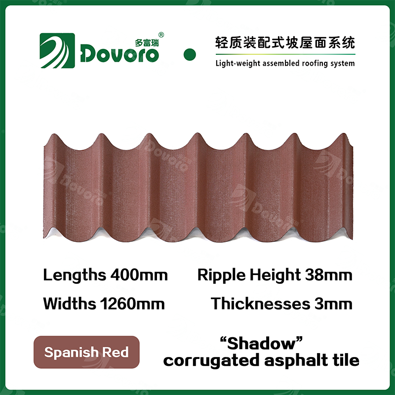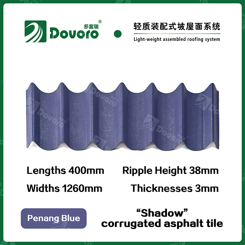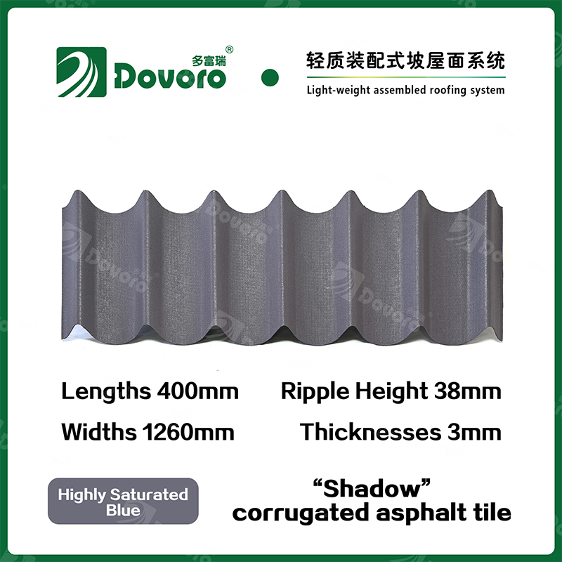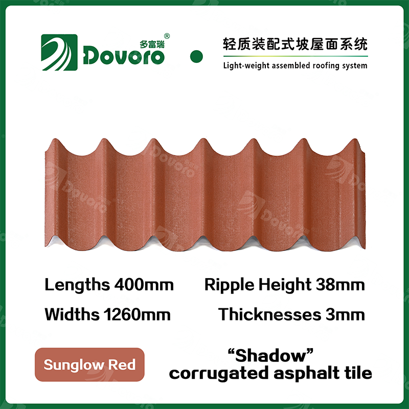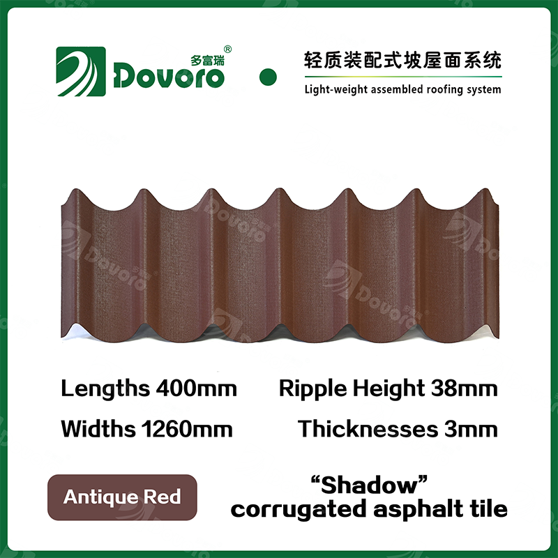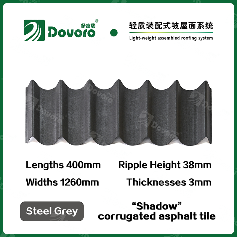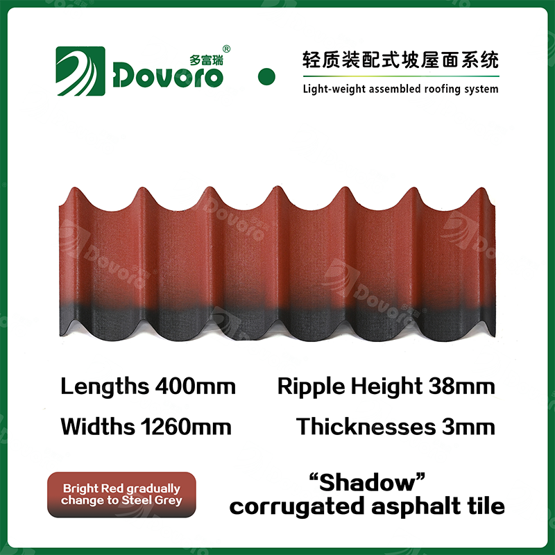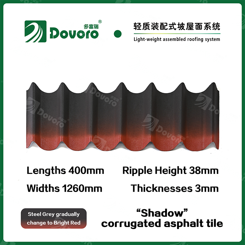 Dovoro “Shadow” corrugated asphalt tile is made of mineral plant fibers soaked in asphalt. The one-time formed base plate is impregnated in asphalt at high temperatures, making the tile more solid as a whole; The thermosetting resin ensures strength and stiffness of tile; Imported raw materials, in combination with advanced coloring technology, ensure long-lasting color, and the mixed color spraying process makes the tile elegant in appearance, beautiful in colors, and stereoscopic in texture.