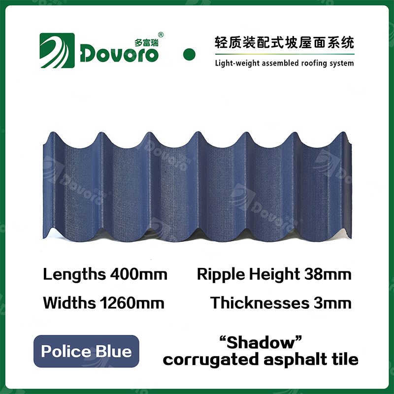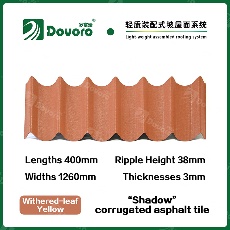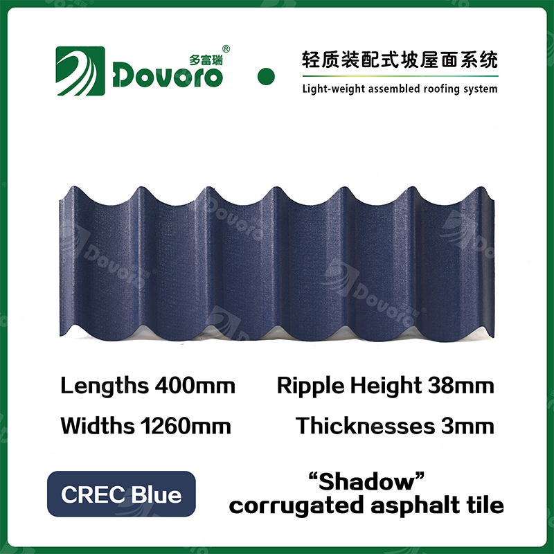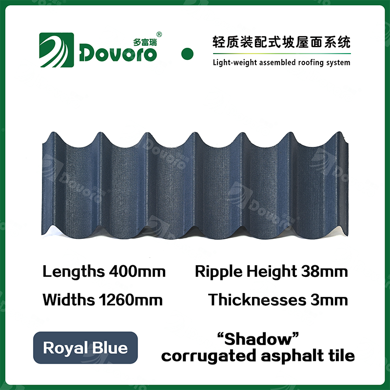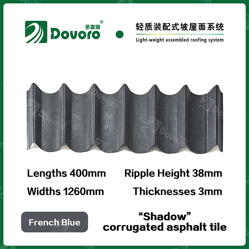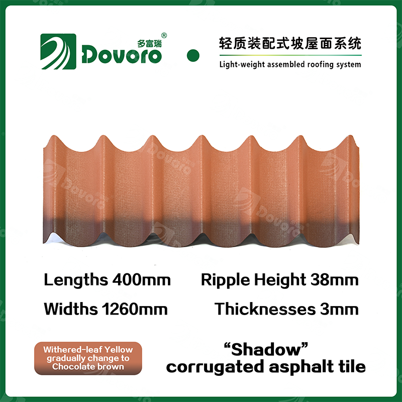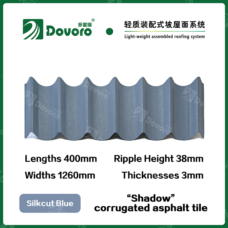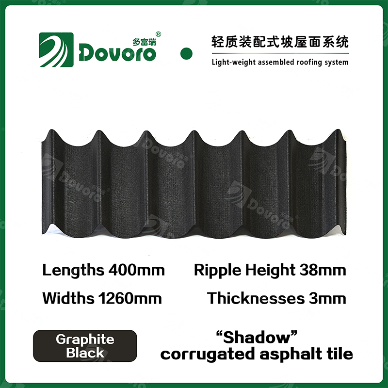 Dovoro “Shadow” corrugated asphalt tile is made of mineral plant fibers soaked in asphalt. The one-time formed base plate is impregnated in asphalt at high temperatures, making the tile more solid as a whole; The thermosetting resin ensures strength and stiffness of tile; Imported raw materials, in combination with advanced coloring technology, ensure long-lasting color, and the mixed color spraying process makes the tile elegant in appearance, beautiful in colors, and stereoscopic in texture.