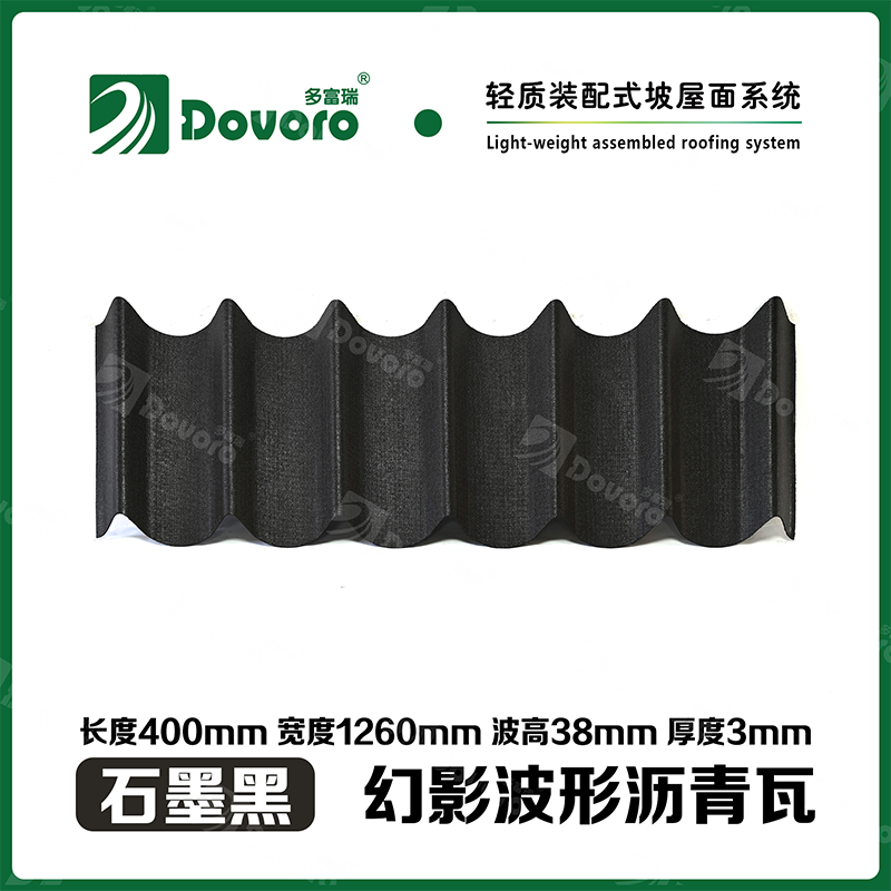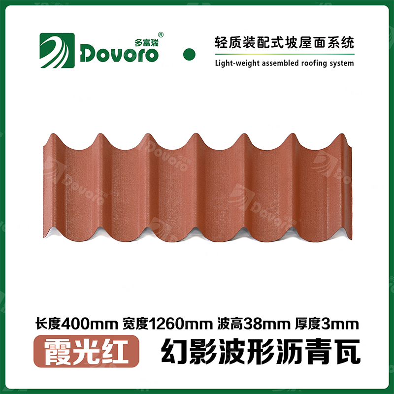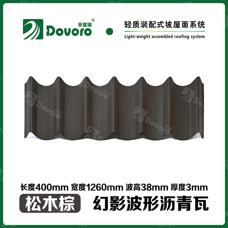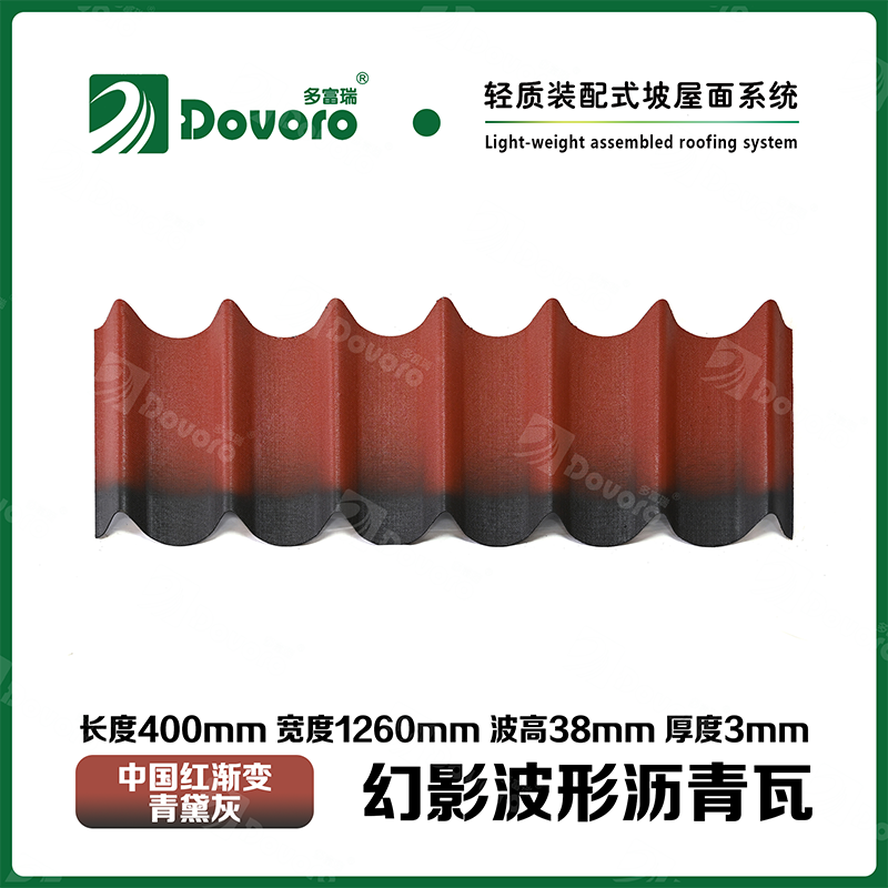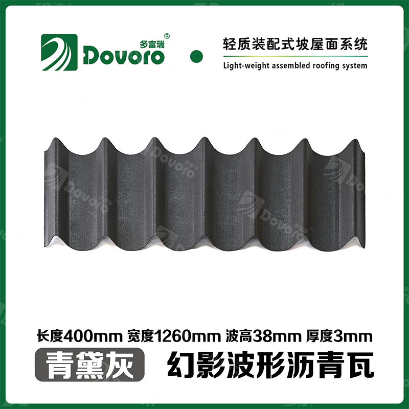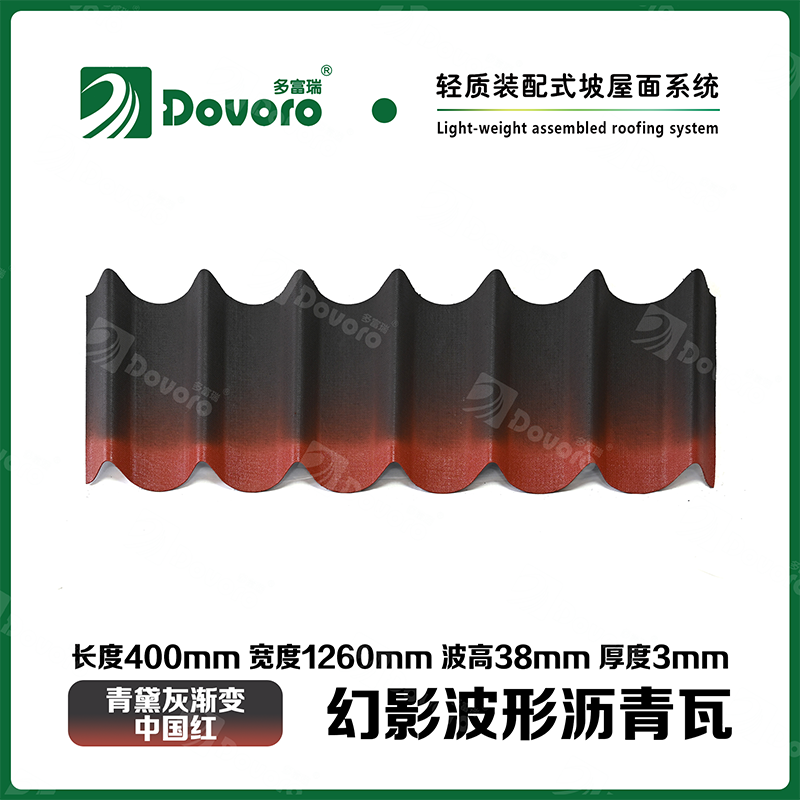 多富瑞幻影波形瀝青瓦是由礦植物纖維板經過整形后浸漬瀝青而成,一次成型的基層板在高溫下浸漬瀝青,使瓦材整體性更加牢固;熱固性樹脂保證了瓦材的強度和剛度;進口原料配合先進的著色工藝確保顏色持久、混色噴涂工藝使瓦材外觀高雅、色彩美觀、立體質感。