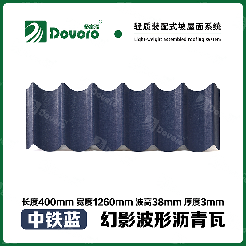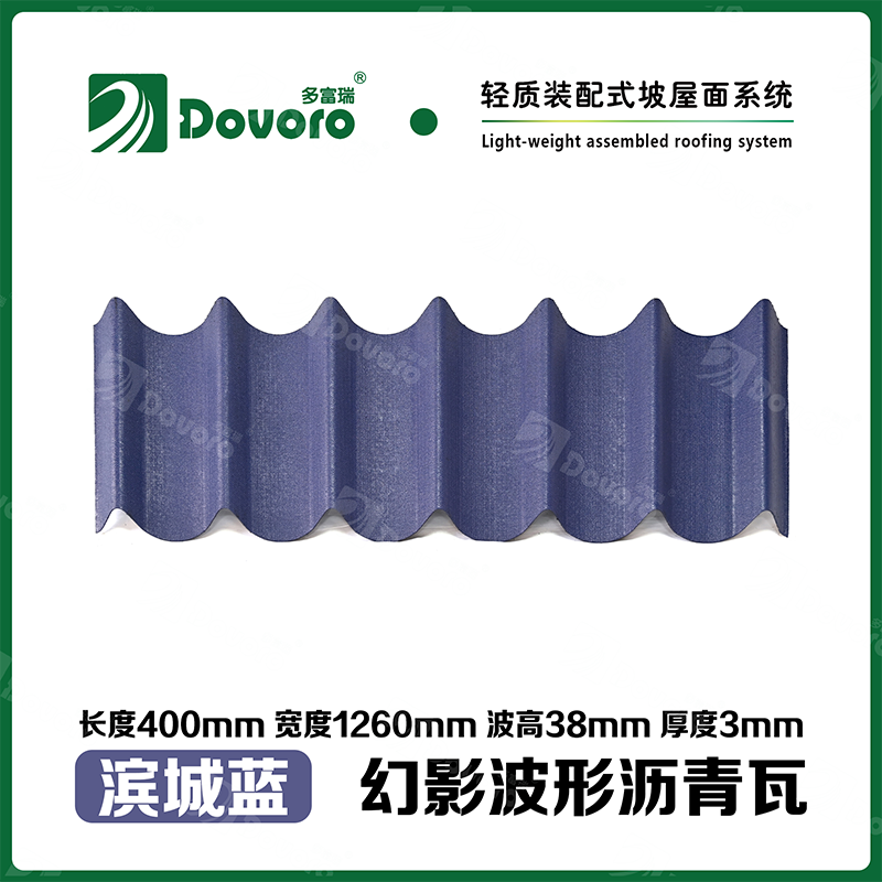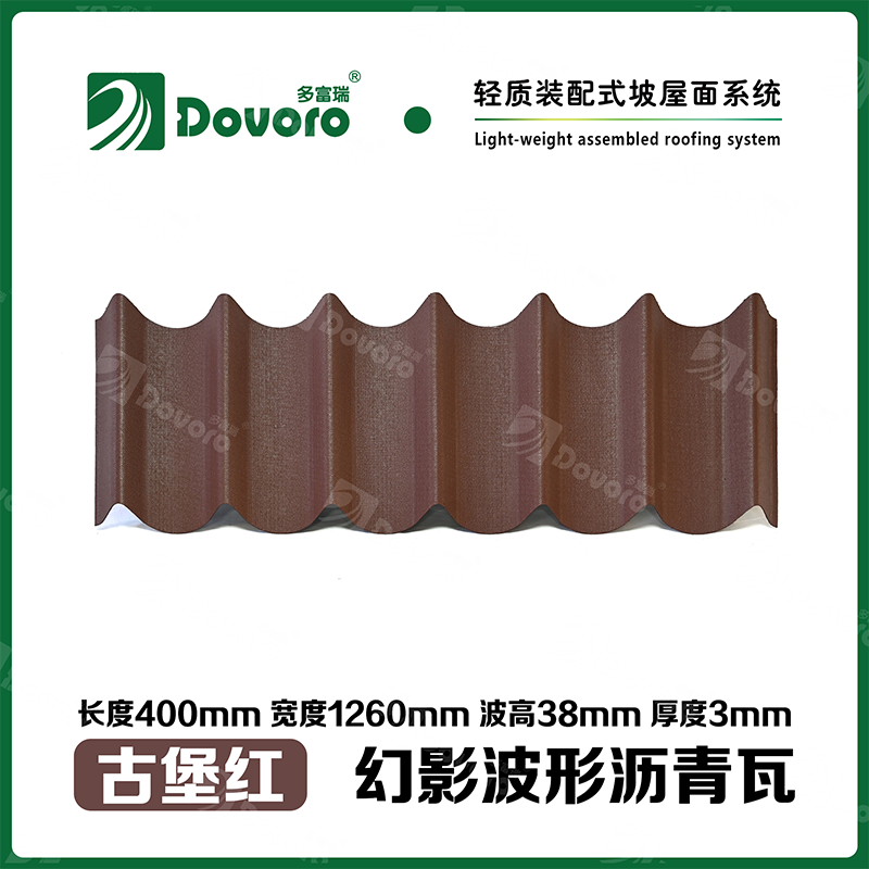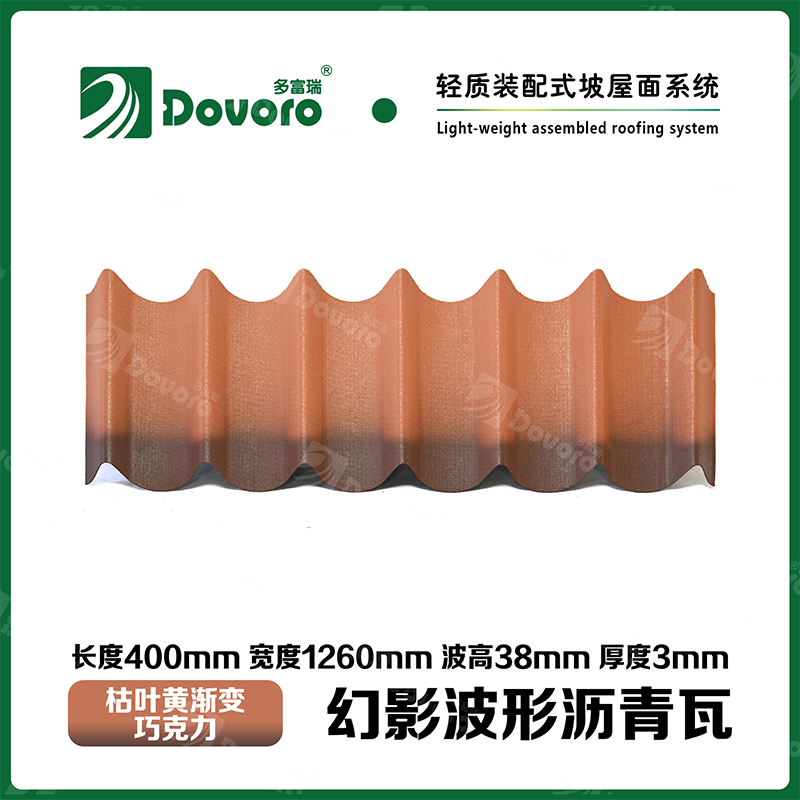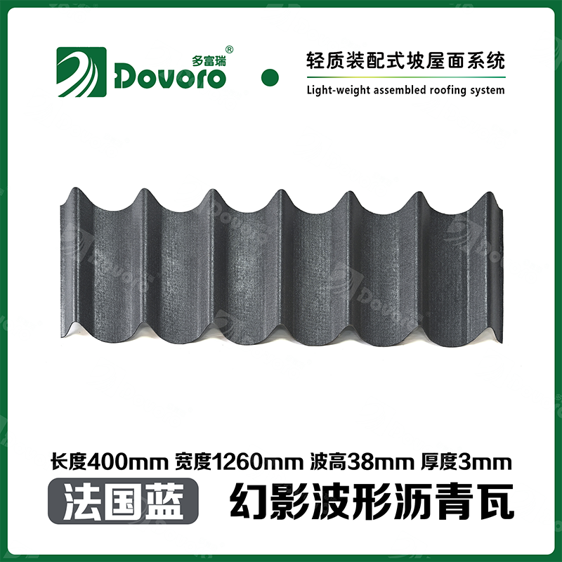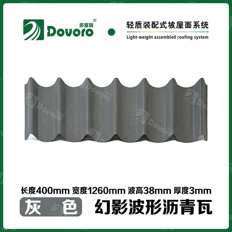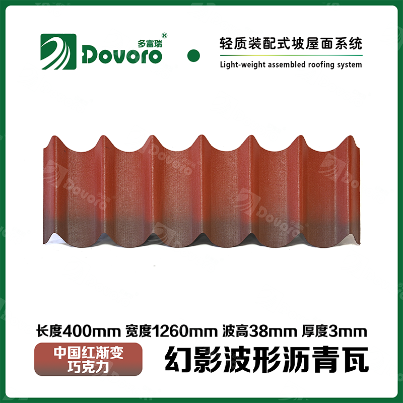 多富瑞幻影波形瀝青瓦是由礦植物纖維板經過整形后浸漬瀝青而成,一次成型的基層板在高溫下浸漬瀝青,使瓦材整體性更加牢固;熱固性樹脂保證了瓦材的強度和剛度;進口原料配合先進的著色工藝確保顏色持久、混色噴涂工藝使瓦材外觀高雅、色彩美觀、立體質感。