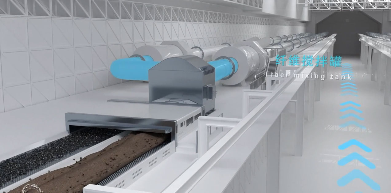 纖維攪拌罐→波紋板加工車間→紙板輥壓機→瀝青板傳送機→瀝青罐