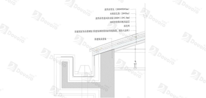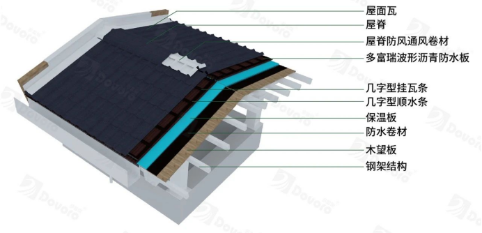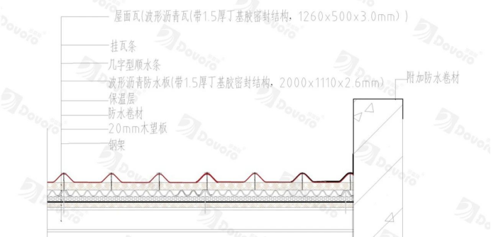 對于民用建筑和滲漏水敏感的建筑屋面,可采用更加全面的施工方案,結(jié)合波形瀝青瓦、波形瀝青防水板、防水卷材等構(gòu)造,共同形成輕質(zhì)、防水、隔熱的屋面系統(tǒng)。