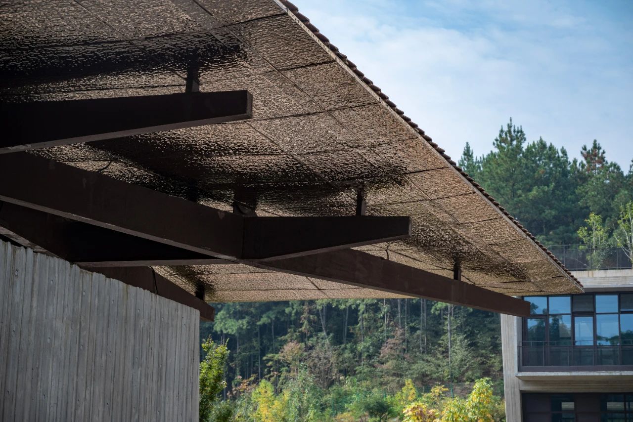 景德鎮(zhèn)是世界著名瓷都,作為藝術氛圍濃厚的特色高校,在景德鎮(zhèn)藝術職業(yè)大學的設計中,就將景德鎮(zhèn)獨特的地域氣質融入和延展在空間之中。屋面設計還需要考慮到整體風格的美感,和傳統(tǒng)文化的表達,最終采用了具有不規(guī)則紋理的陶瓦,搭配波形瀝青防水板進行施工。