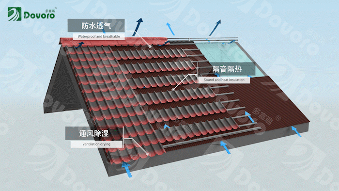 波形瀝青防水板采用了與波形瀝青瓦同樣的防排結合設計。遇到極端降雨天氣,一旦屋面瓦材發生滲漏,雨水也會順著波形瀝青防水板從上往下排出屋面,將屋面漏水的概率降至最低。