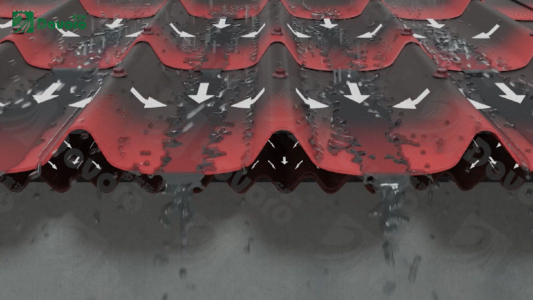 對于建筑而言,除了厚重積雪的壓力,轉(zhuǎn)晴后雪化成水也是不小的挑戰(zhàn)。波形瀝青瓦與波形瀝青防水板的瀝青含量≥40%,吸水率≤20%,材料本身就已經(jīng)足夠防水。防排結(jié)合的設(shè)計(jì),波浪造型有利于水從波峰流至波谷,再從上而下將水排出,提升排水效率,解決雪水聚積的現(xiàn)象,從根本上降低屋面漏水發(fā)生的概率。