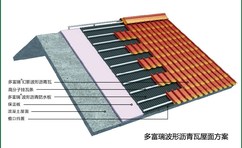 防水板是由植物纖維、礦物纖維和瀝青結(jié)合而成的復(fù)合新型波形防水材料,除自身具備防水性能外,還起到通風(fēng)、除濕等輔助作用,最重要的是在不影響自身性能的前提下把混凝土基層、保溫層和屋面瓦快速有效地整合起來。